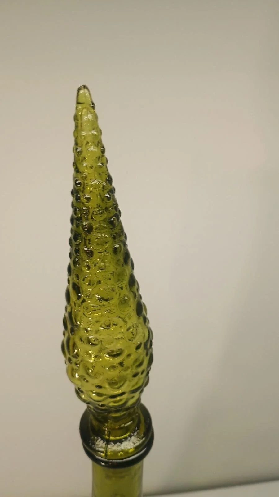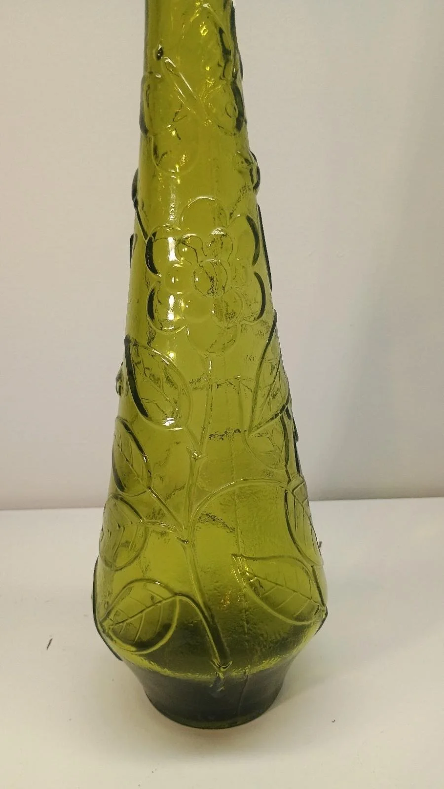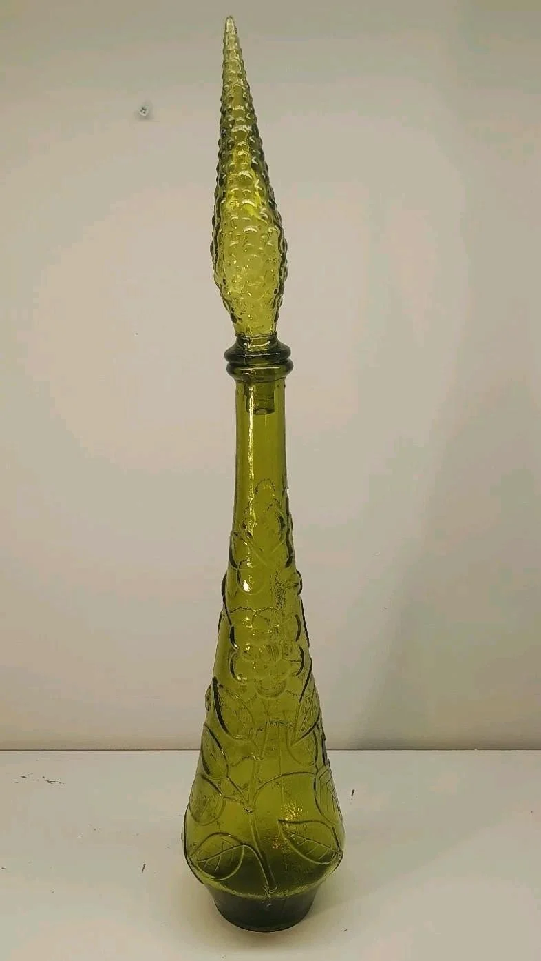 Pottery/Art Glass › 23" Empoli Glass Genie Bottle Decanter Avocado Green Floral Butterfly Design Image 1 of 6 Image 2 of 6 Image 3 of 6 Image 4 of 6 Image 5 of 6 Image 6 of 6 23" Empoli Glass Genie Bottle Decanter Avocado Green Floral Butterfly Design $80.00 No chips or cracks found. Seems to be in good condition overall Add To Cart Added! No chips or cracks found. Seems to be in good condition overall