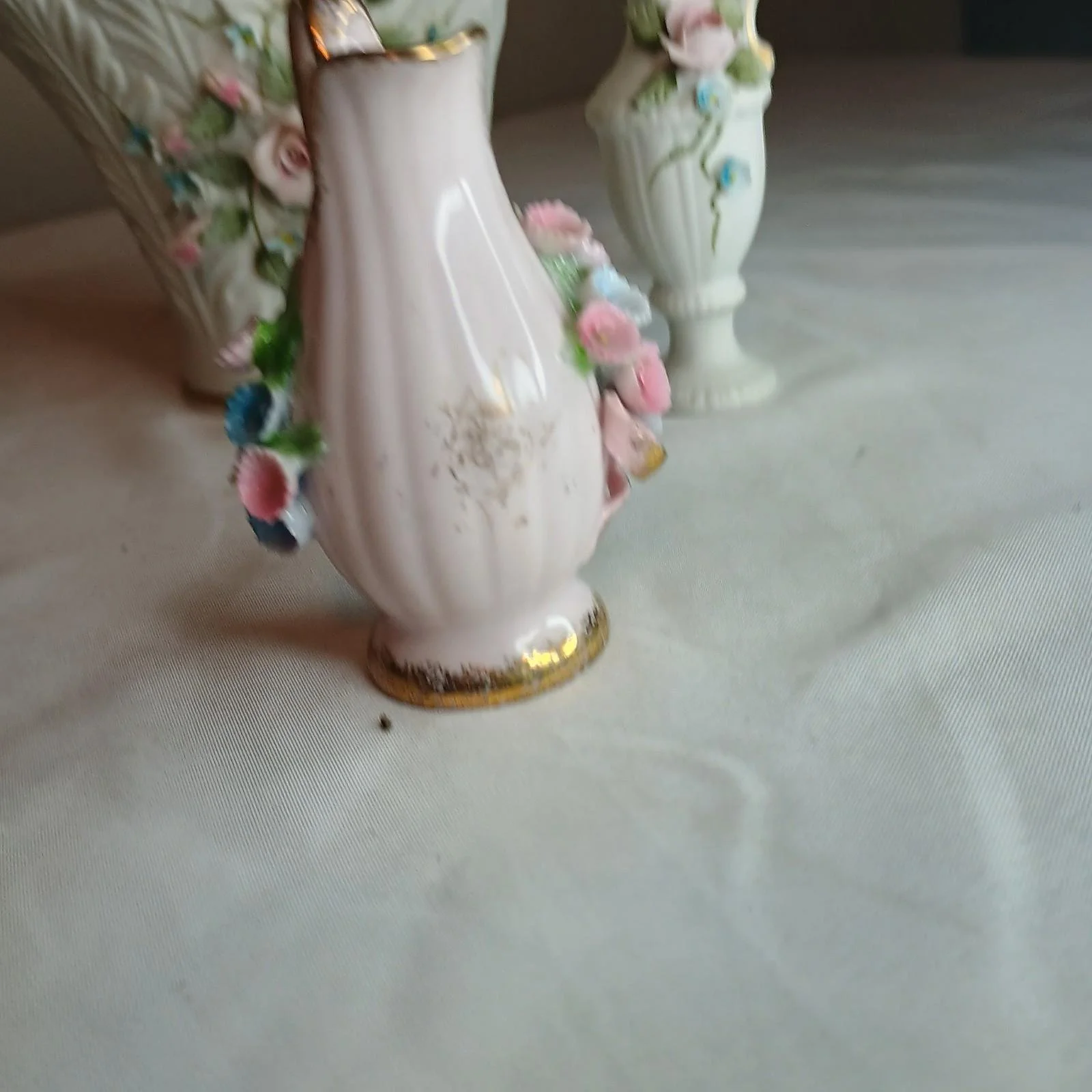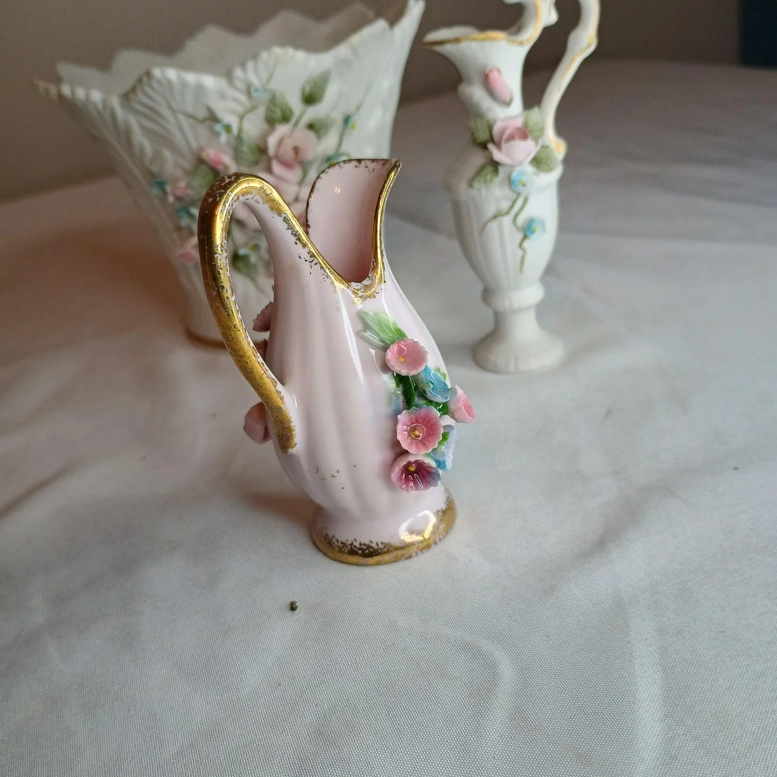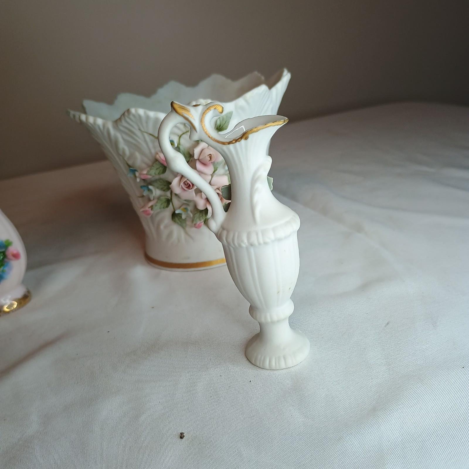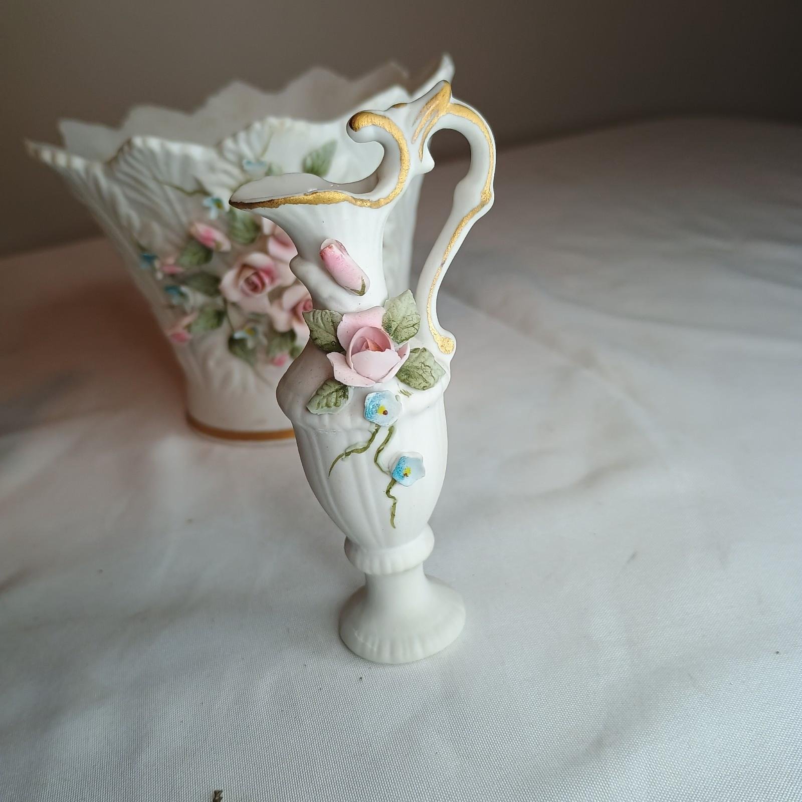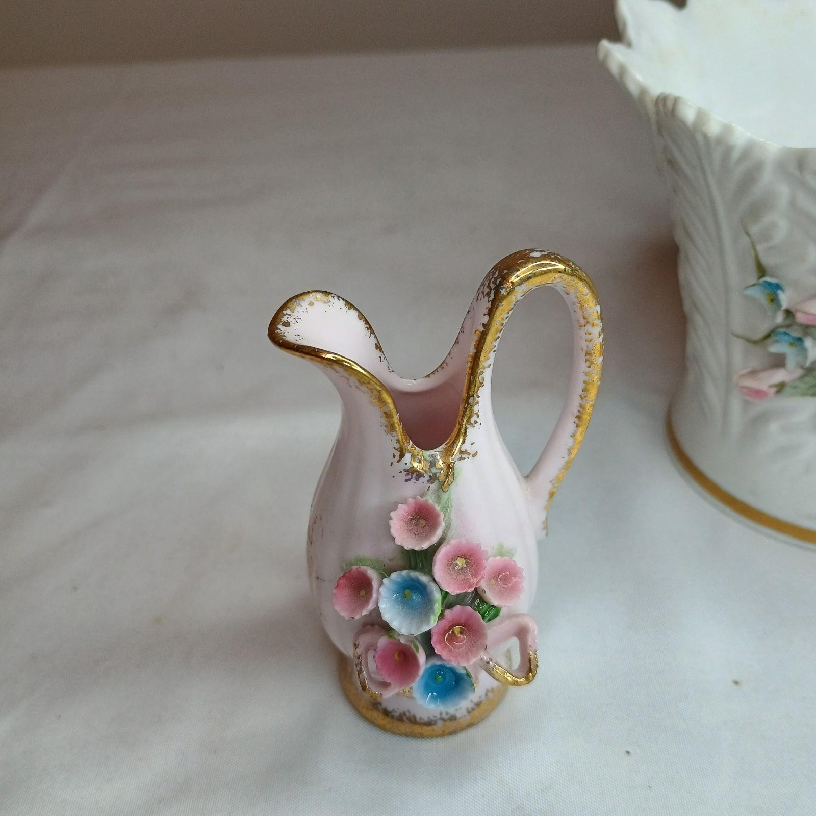 (3) Lefton Hand Painted Miniature Vases With Handle Tooth Pick Holder Or Vase 3”