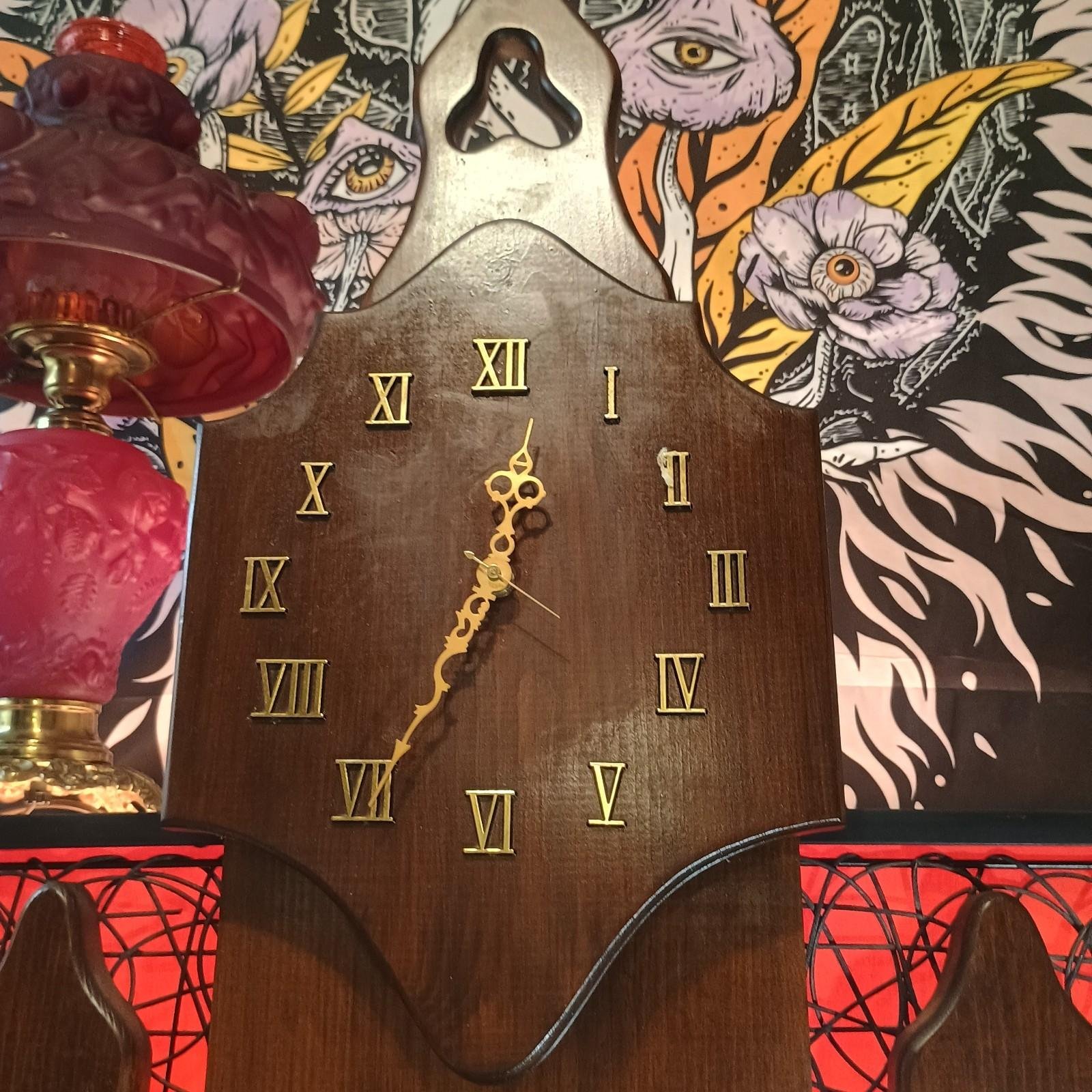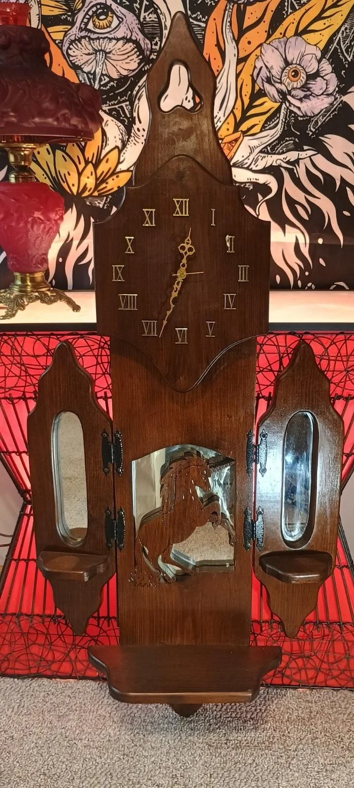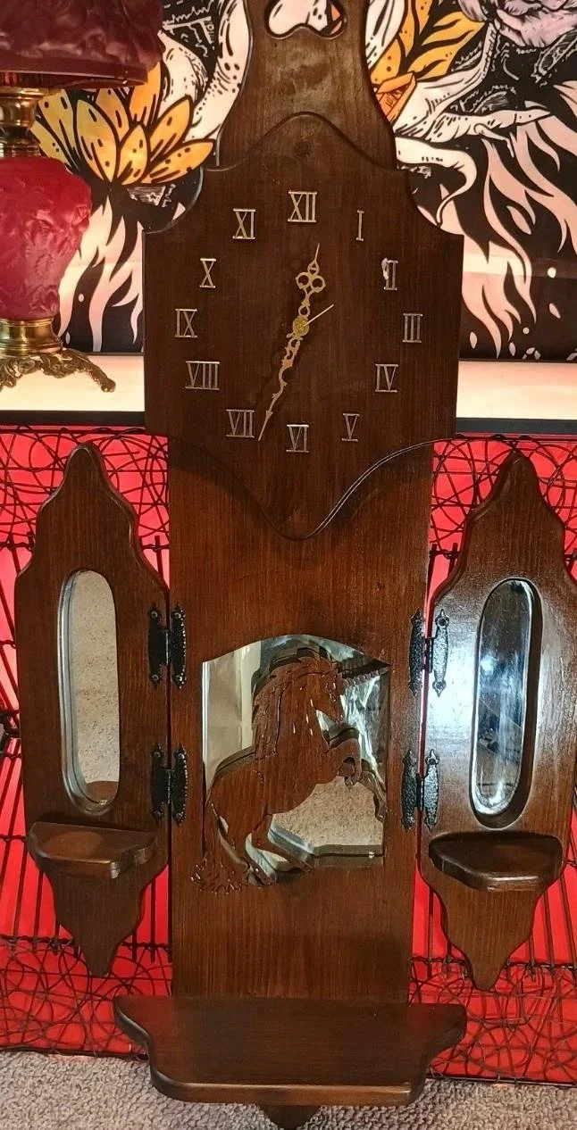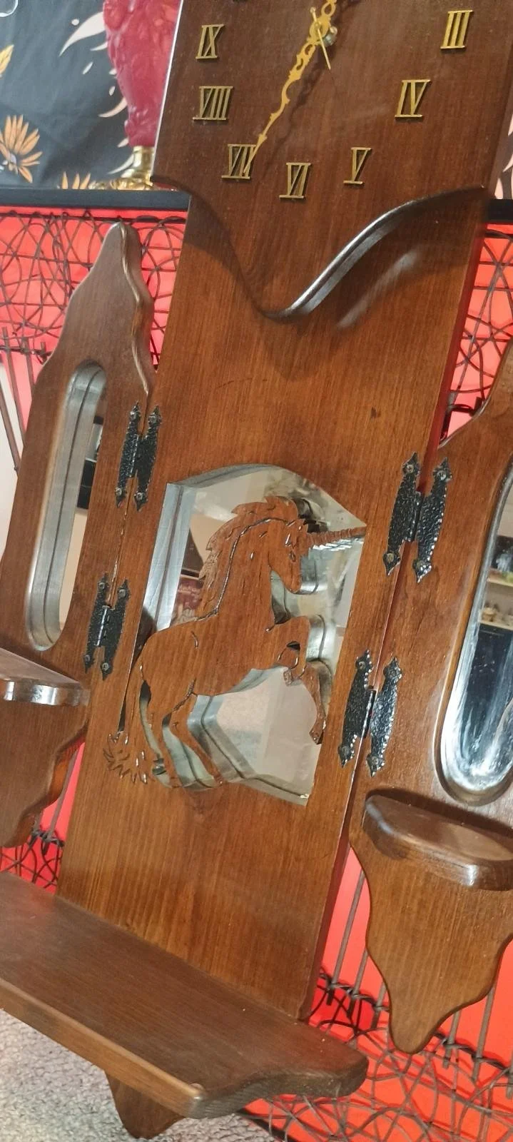Pottery/Art Glass › Large Wooden Wall Clock w/ Wing Panels, Unicorn Design Mirror Backing 48" Tall Image 1 of 7 Image 2 of 7 Image 3 of 7 Image 4 of 7 Image 5 of 7 Image 6 of 7 Image 7 of 7 Large Wooden Wall Clock w/ Wing Panels, Unicorn Design Mirror Backing 48" Tall $140.40 Good condition and working. 48" tall by 22" wide. Add To Cart Added! Good condition and working. 48" tall by 22" wide.