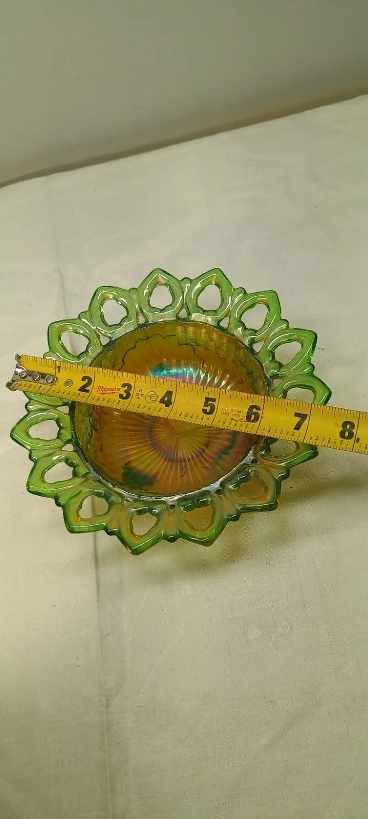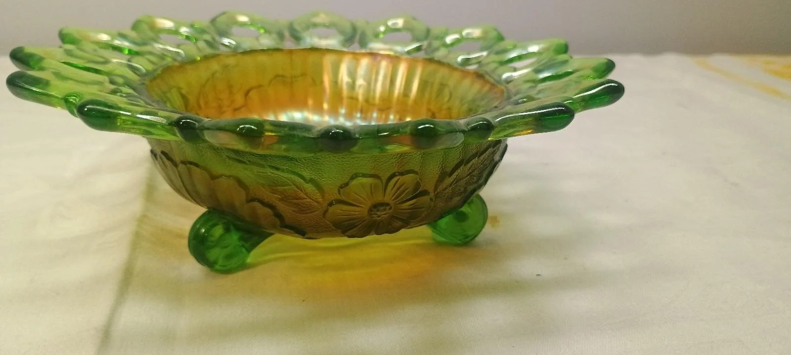Pottery/Art Glass › Northwood Carnival Glass Green/Gold Wild Rose 3-Footed Candy Bowl 1910s Image 1 of 5 Image 2 of 5 Image 3 of 5 Image 4 of 5 Image 5 of 5 Northwood Carnival Glass Green/Gold Wild Rose 3-Footed Candy Bowl 1910s $45.00 Good condition no chips or cracks Add To Cart Added! Good condition no chips or cracks