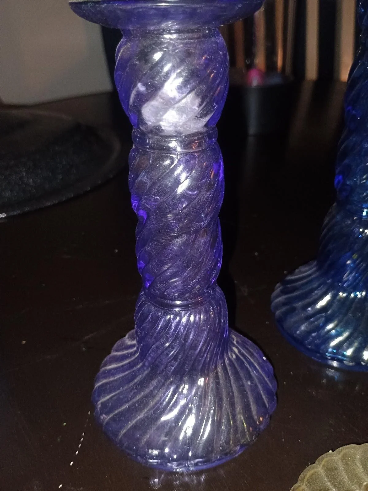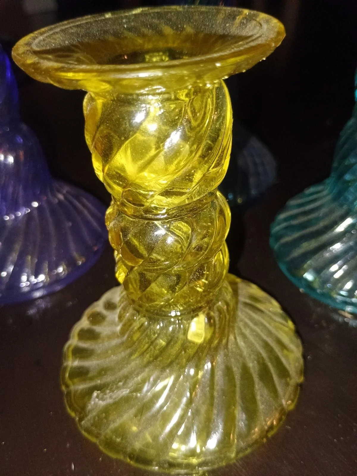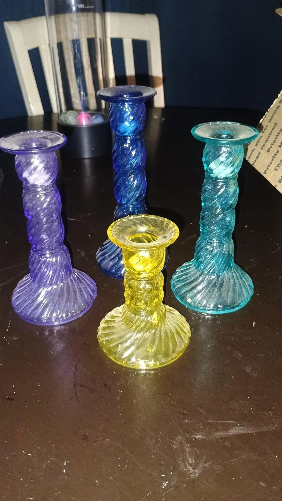 Pottery/Art Glass › Twisted Glass Multi Color Candlestick Holders (Set Of 4) Image 1 of 6 Image 2 of 6 Image 3 of 6 Image 4 of 6 Image 5 of 6 Image 6 of 6 Twisted Glass Multi Color Candlestick Holders (Set Of 4) $27.00 4 holders. Range in size from approximately 4" to 8". Good condition Add To Cart Added! 4 holders. Range in size from approximately 4" to 8". Good condition