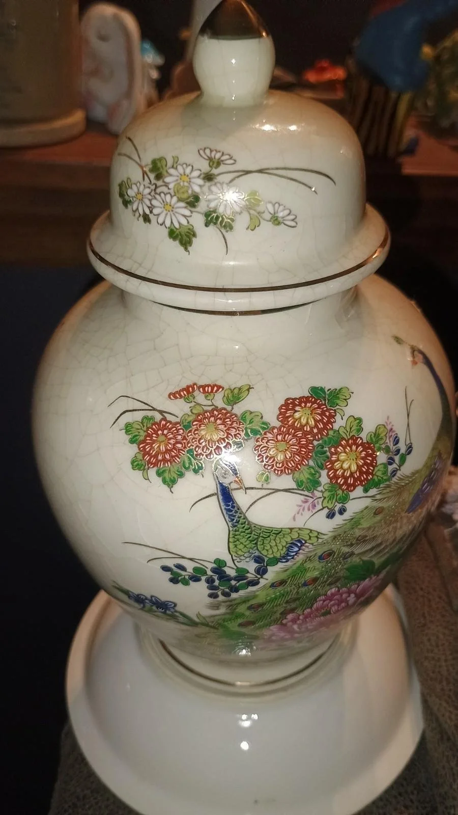 Pottery/Art Glass › Vintage Andrea by Sadek Ginger Jar Peacocks & Floral Crackle Design w/Gold Japan Image 1 of 4 Image 2 of 4 Image 3 of 4 Image 4 of 4 Vintage Andrea by Sadek Ginger Jar Peacocks & Floral Crackle Design w/Gold Japan $19.44 No chips or cracks. It does have some crazing Add To Cart Added! No chips or cracks. It does have some crazing