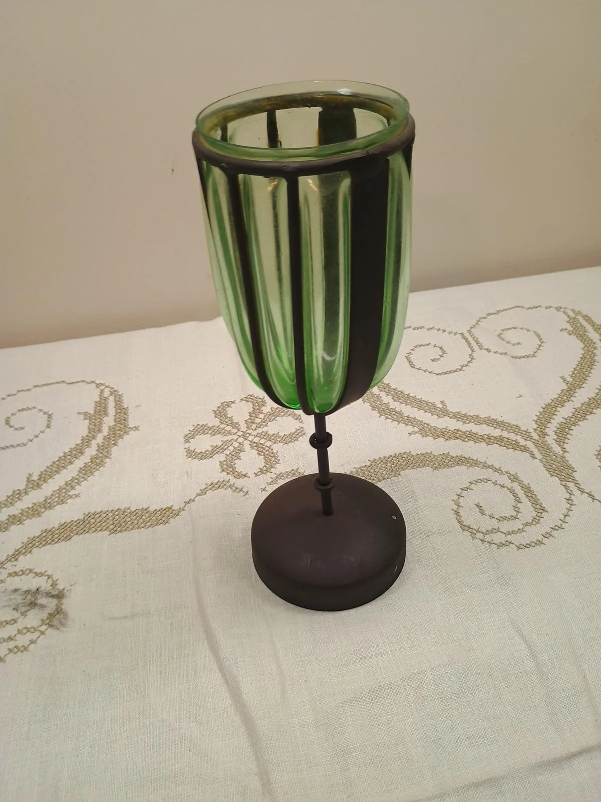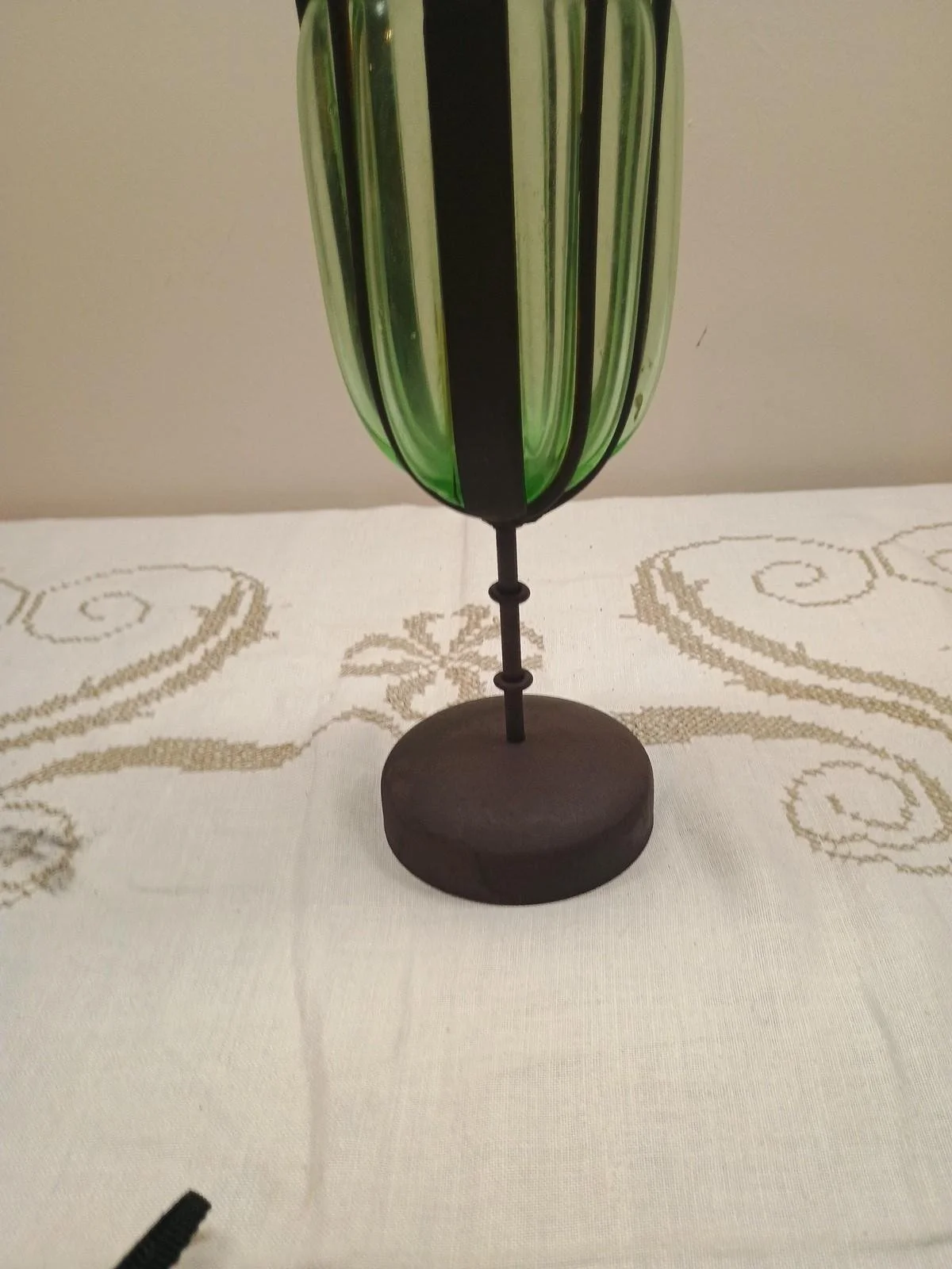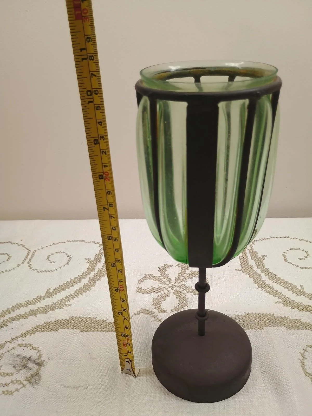 Pottery/Art Glass › Vintage Caged Green Blown Art Glass Candle Cast Wrought Iron Brutalist Gothic Image 1 of 5 Image 2 of 5 Image 3 of 5 Image 4 of 5 Image 5 of 5 Vintage Caged Green Blown Art Glass Candle Cast Wrought Iron Brutalist Gothic $17.50 No chips or cracks Add To Cart Added! No chips or cracks