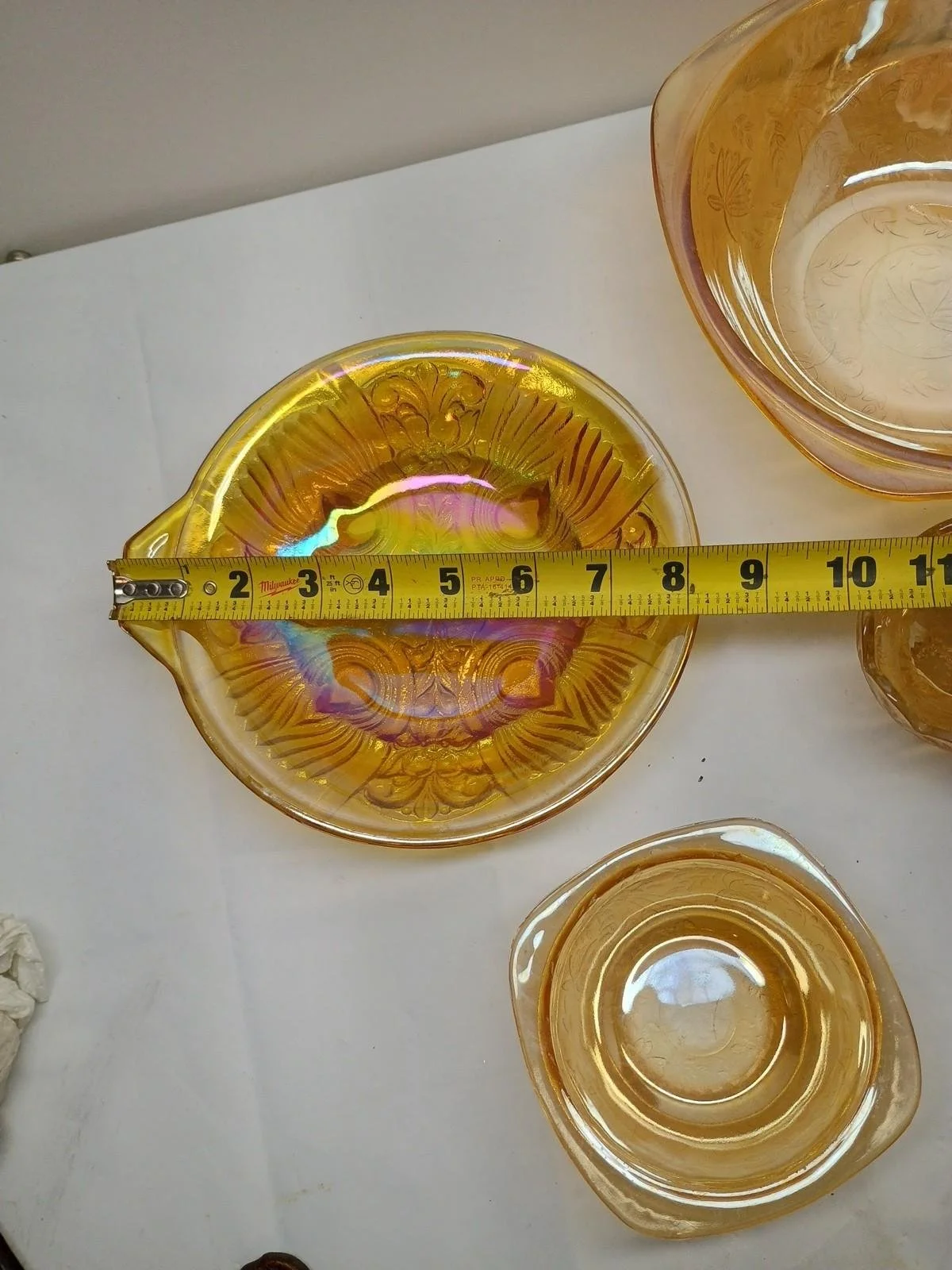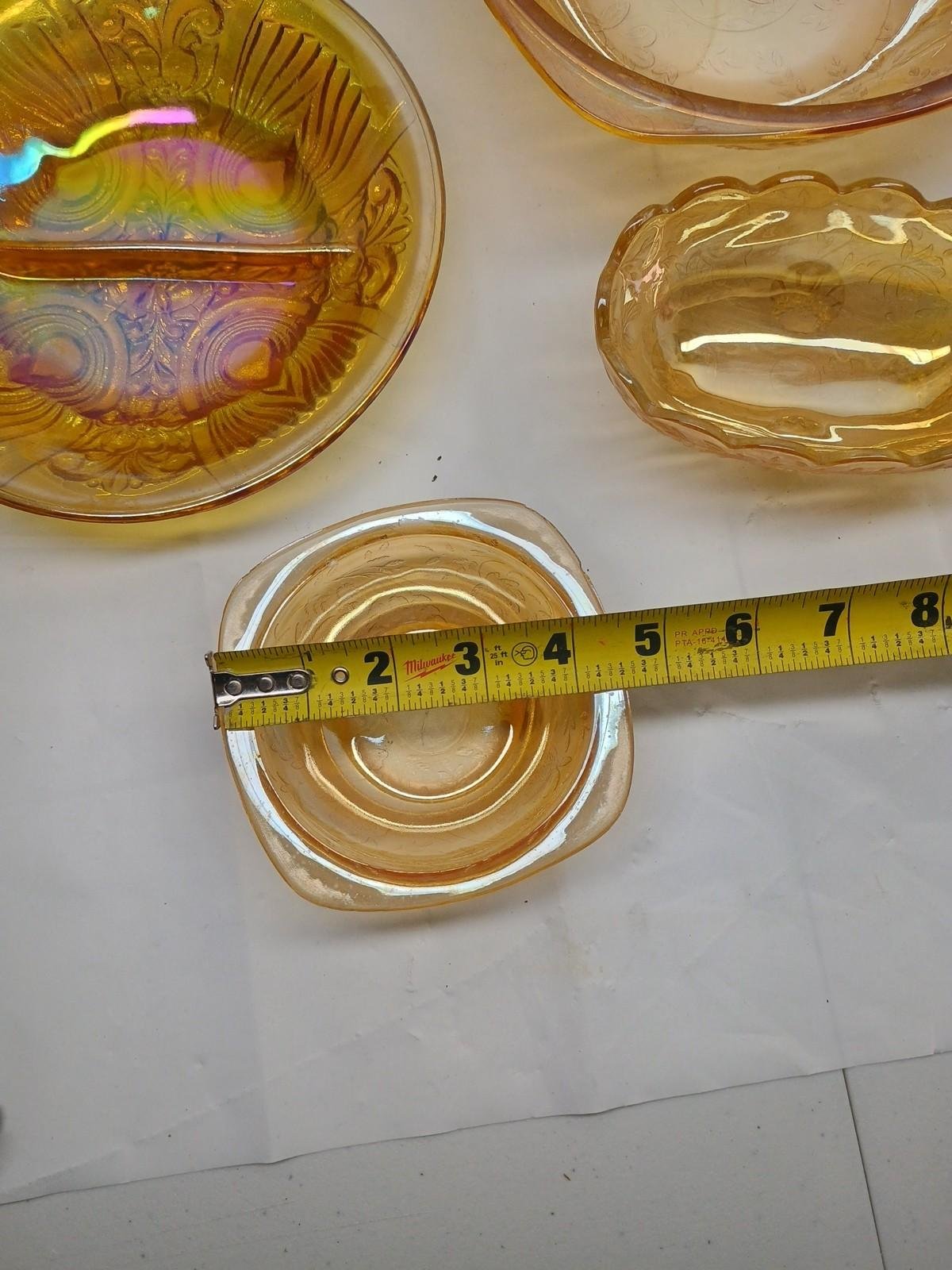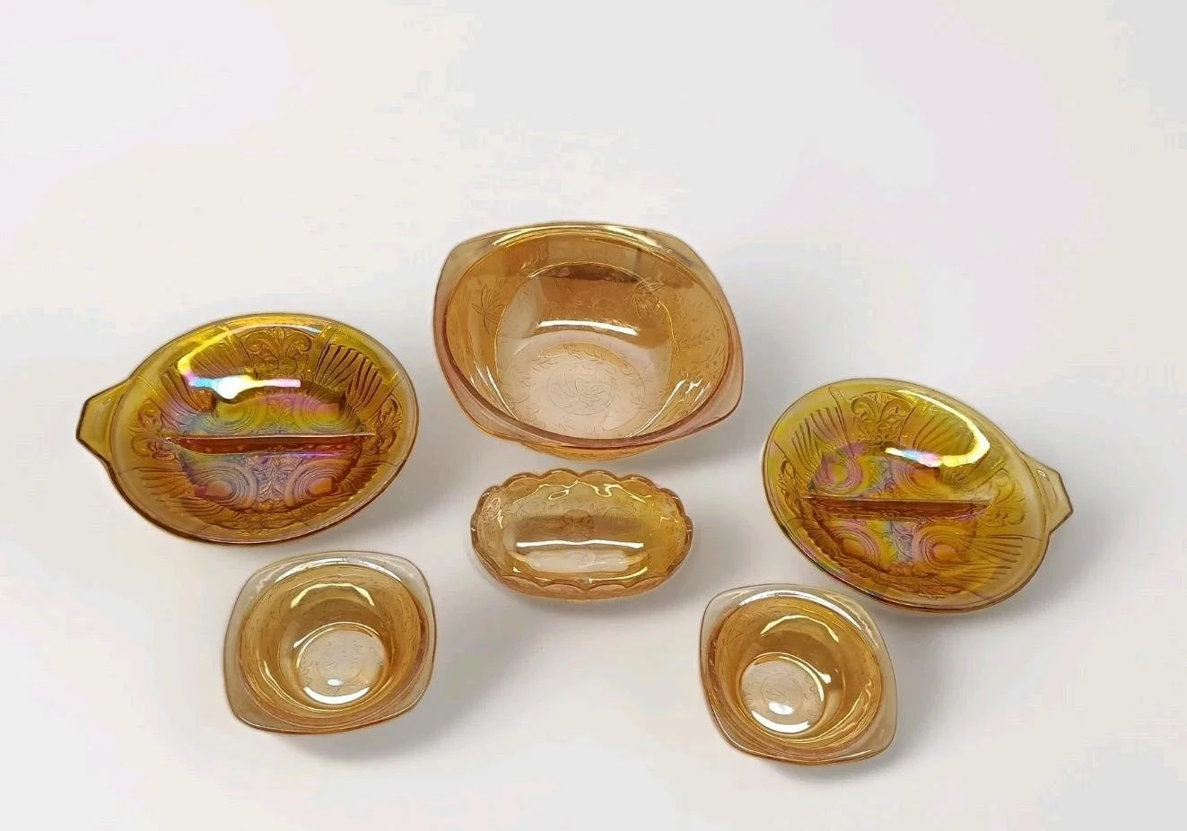 **Very rarely do I even consider selling any piece that's chipped or otherwise imperfect. It would be shown in the photos and description very transparently if so. Thanks!**Two side bowls resemble Anchor Hocking pieces and middle pieces are Jeanette. Photos are the best description