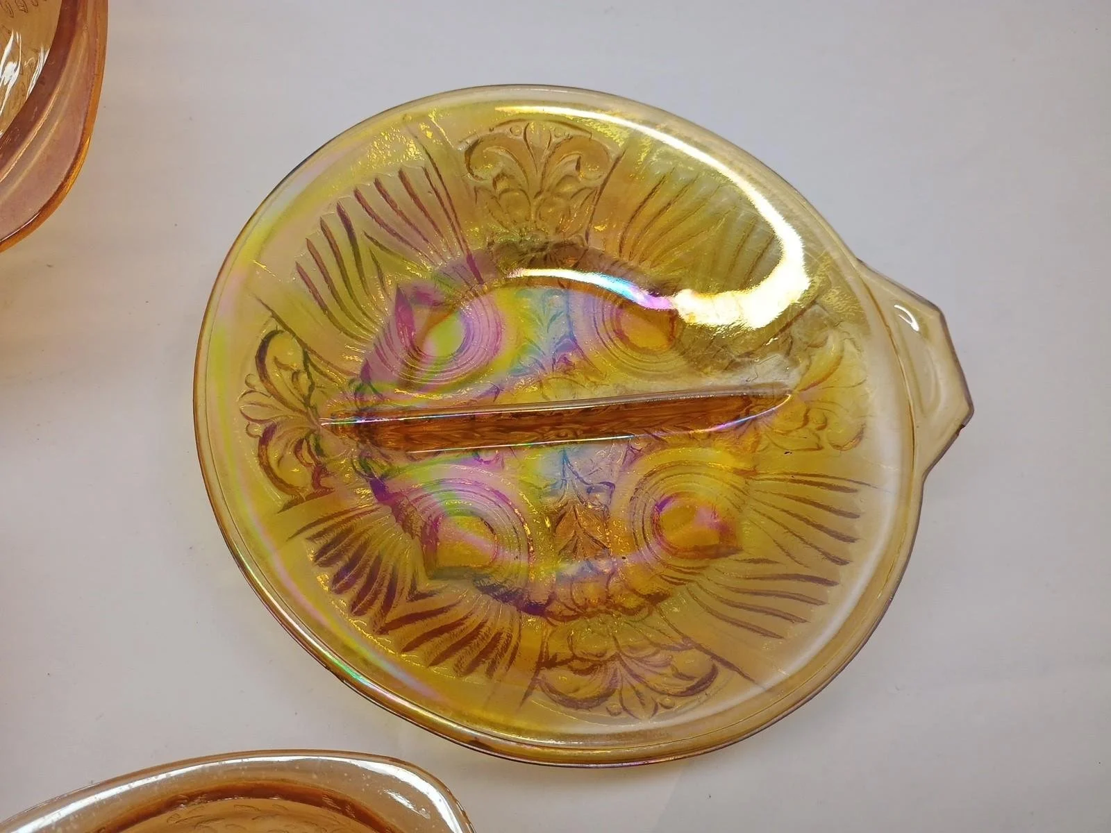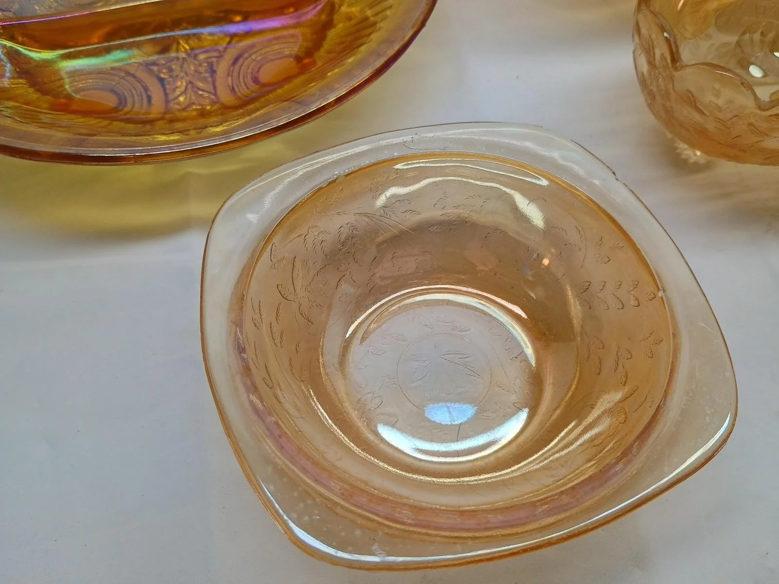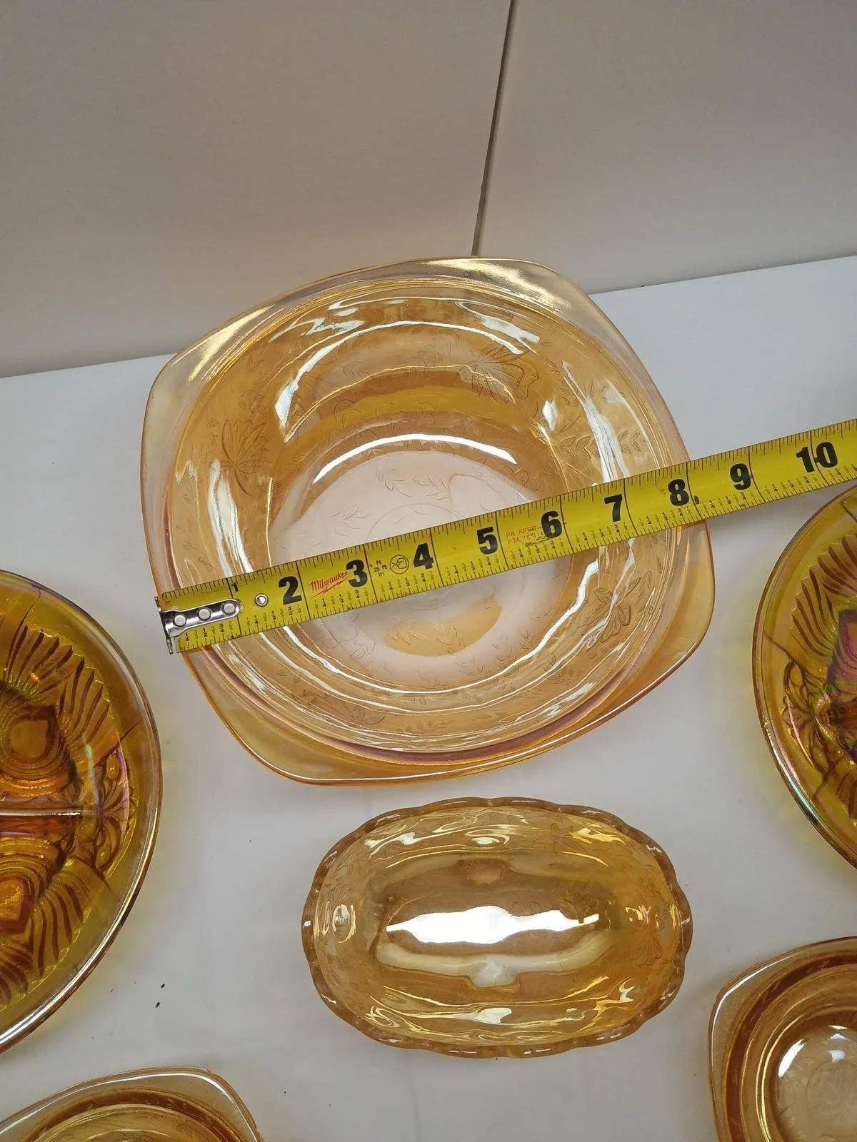 **Very rarely do I even consider selling any piece that's chipped or otherwise imperfect. It would be shown in the photos and description very transparently if so. Thanks!**Two side bowls resemble Anchor Hocking pieces and middle pieces are Jeanette. Photos are the best description